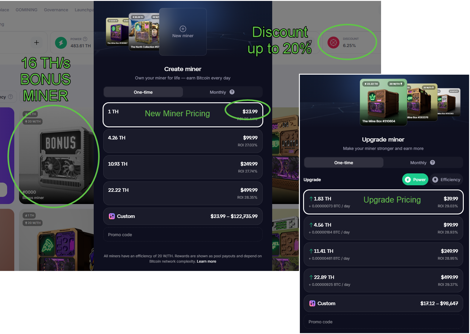 Check out the real in-app screenshots to se actual pricing, bonus miner, discounts below. Or click here.